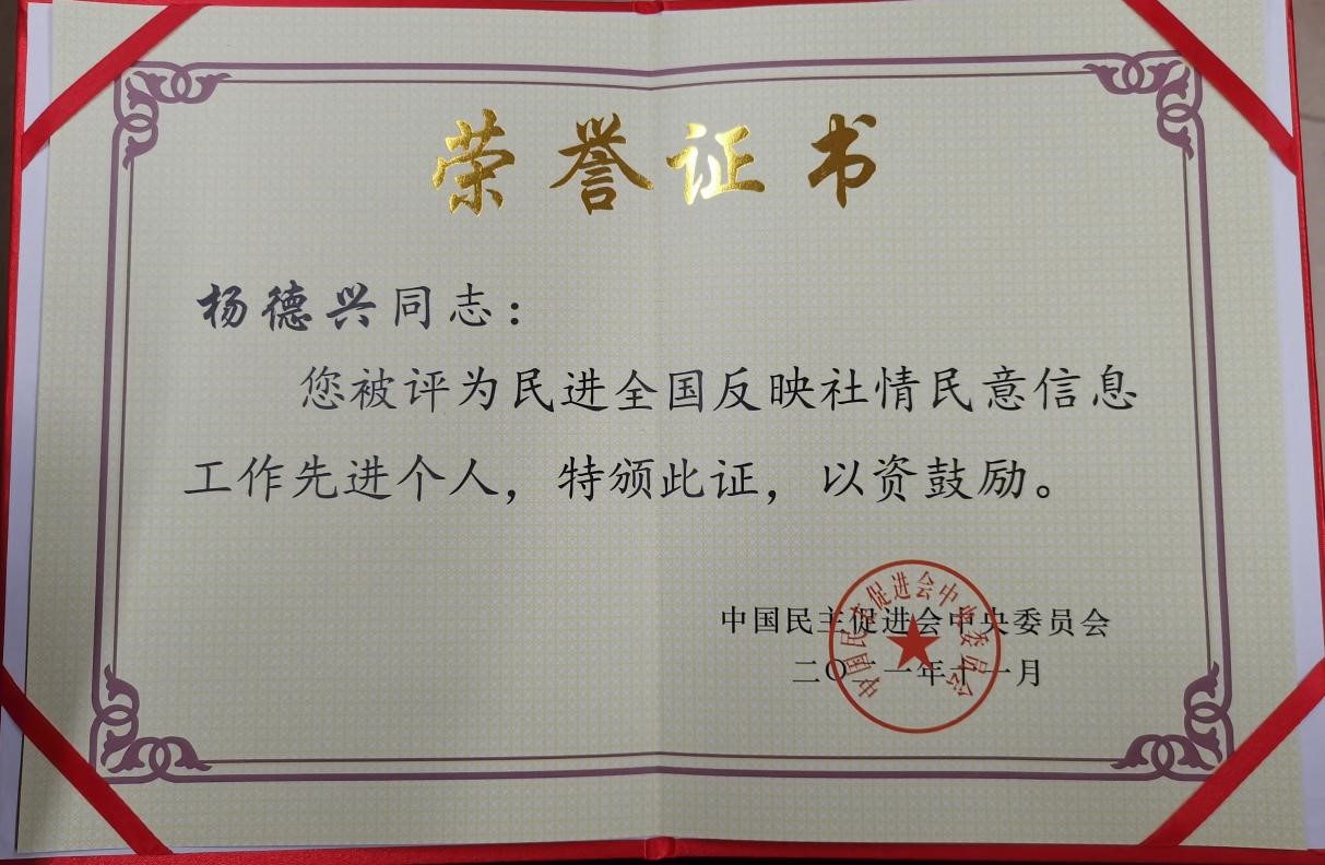 近年来,杨德兴同志作为民进西工大总支主委,积极组织会员在全国各地开展调研活动和特色活动,关注、了解、分析了科技、教育、医疗、社会民生等领域亟待解决的问题和地区间的差异,特别是新冠肺炎疫情暴发后及时分析防疫形势,积极组织会员撰写社情民意信息,并针对疫情形势和社会民生问题,提交了10余篇相关信息,其中《关于建立医疗支援后备队伍的建议》被民进中央采用。