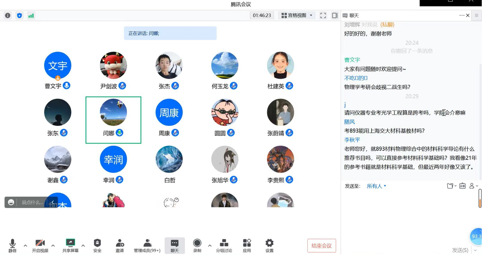 学生分享结束后,院长助理闫娜与参会同学展开积极互动交流,详尽回答了同学们关于推免和统考的各类问题,聆听同学们的需求,为后续正式开始招生工作做好准备。会议的最后,闫娜教授为所有学生献上亲切祝福:“星光不问赶路人,静候开花传佳音。希望各位同学推免顺利,考研理想,不负韶华,相约工大”。