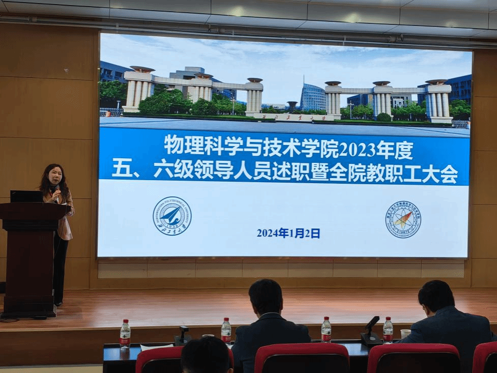 会上,翟薇院长首先做了学院2023年工作总结汇报。翟薇院长全面总结了学院2023年在学科建设、教育教学、科学研究、人才培养等方面取得的标志性成果,从党建工作、本科生培养、研究生培养、师资队伍建设、科学研究、国际合作等方面对总体工作与改革成效进行了介绍,并对学院2023年绩效分配方案进行了详细的阐述。汇报最后,翟薇院长就本年度学院存在问题及2024年重点工作安排做了细致的梳理。她指出,全院教职工要继续锚定学校“127”发展目标,加快建设一流物理学院。
