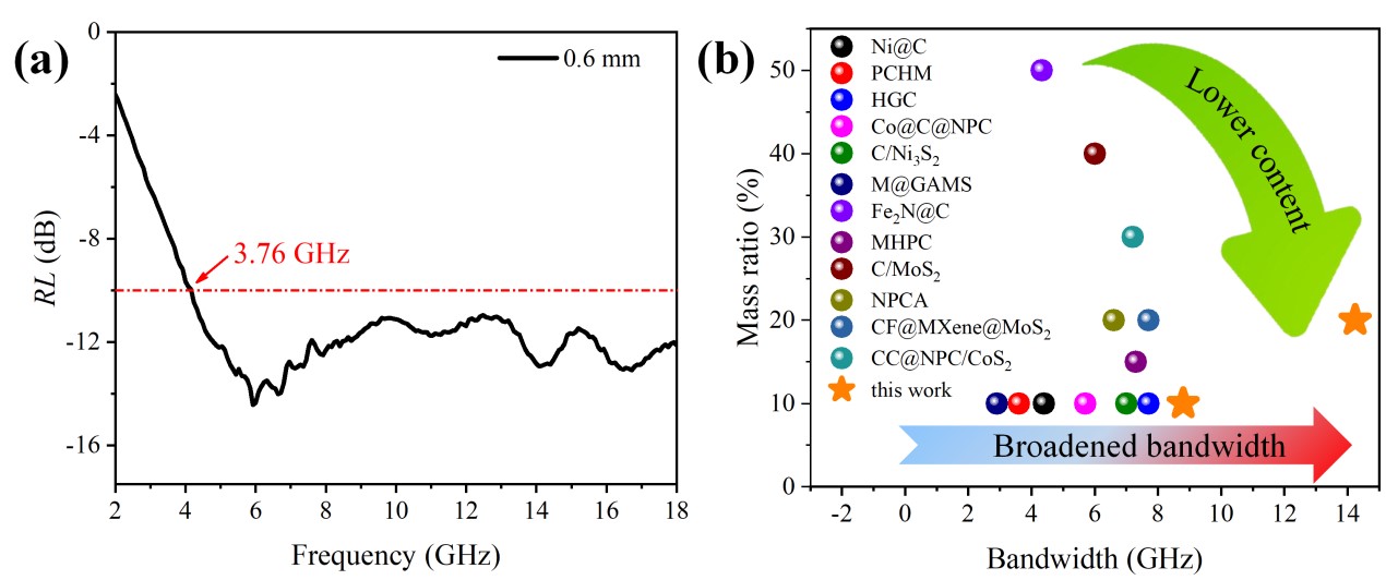 图3 泡沫镍基材料超薄、超宽屏吸收带宽图以及吸波性能对比图