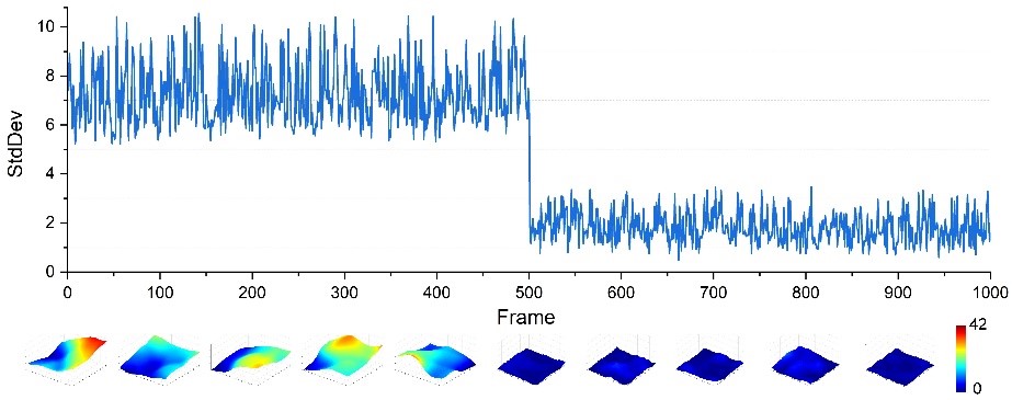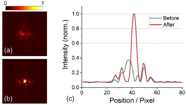 为了进一步验证该方法的可行性,研究团队借助实验室湍流池模拟大气湍流,采用数字全息光路记录波前畸变相位作为神经网络的输出标准,同时记录加载在强度型空间光调制器上的图像作为神经网络的输入。训练后的神经网络便可以直接从变形的强度图中恢复波前畸变相位,并使用相位型空间光调制器进行矫正(见图2)。校正后,波前相位的标准差降为之前的1/4(见图3),凸透镜聚焦光斑的最大值增加到之前的2.5倍(见图4)。