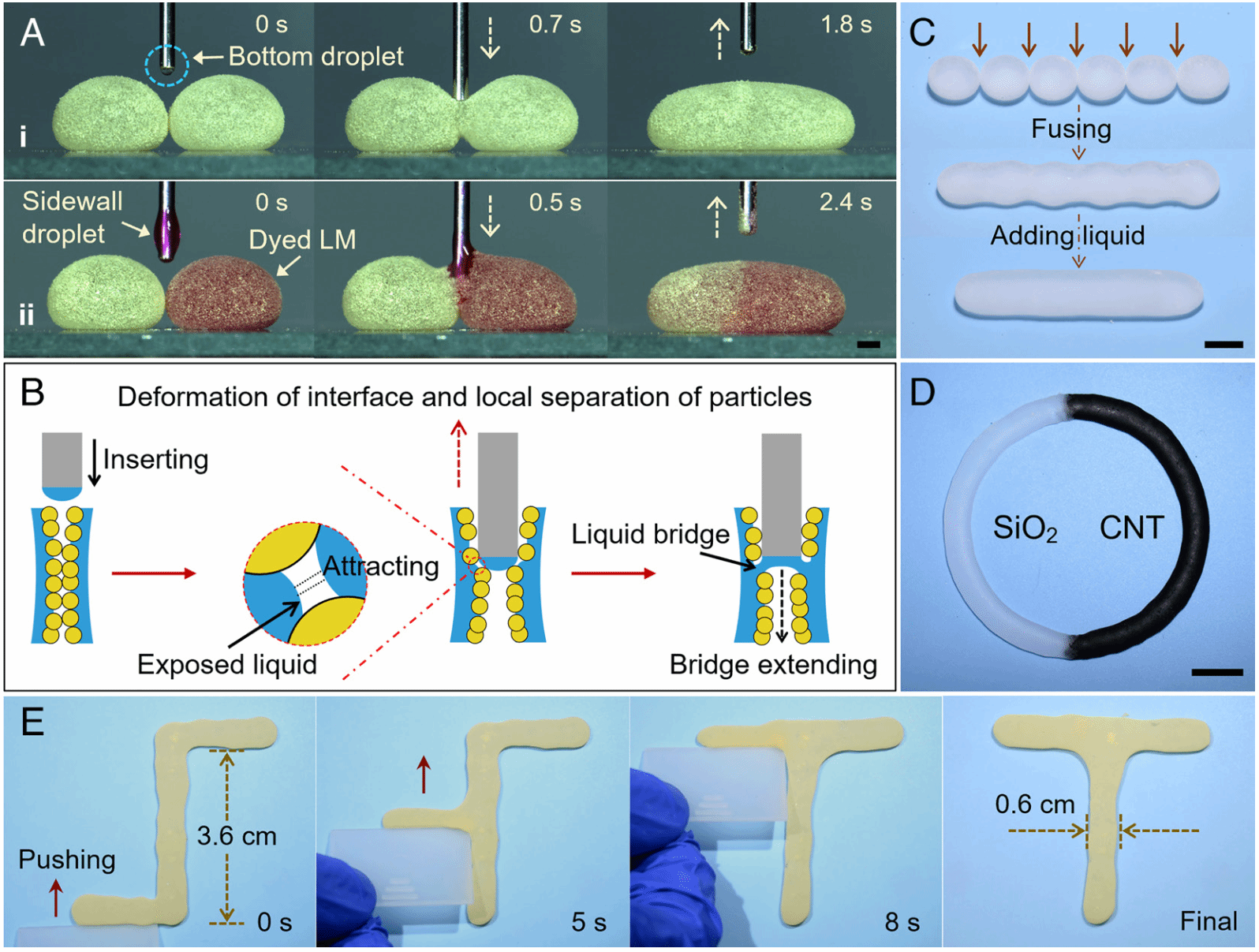 容器在各类科学实验中必不可少,常用的容器如烧杯、培养皿等皆为固体材质,在封闭样品的同时也阻碍了样品与外界的相互作用。以球形液滴和液体弹珠为代表的液体容器具有开放性,在很多应用中具有重要价值。然而,液滴形状的单一性限制了样品操控和功能设计,因此,获得复杂形状液体容器具有重要意义。