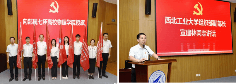 接着,举行了授旗仪式,西北工业大学组织部副部长宣建林分别向部属七所高校物理学院授旗,这是红色教育主题实践活动的标志,更是我们精神的指引和行动的号角。最后,他对延安丰富的红色资源和历史文化进行了详细介绍,并强调了“我要进延安”红色教育的重要性,为广大师生未来在延安的学习指明了方向、注入了动力。
