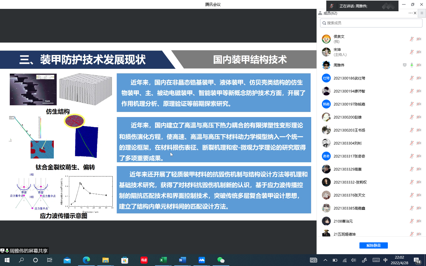 为提高学院同学对我院相关专业的认知能力、开拓专业视野,4月28日晚,中国兵器工业第五二研究所烟台事业部副主任、中国兵工学会军用防护技术专业委员会委员、物理学院优秀校友周雅伟高级工程师以“装甲防护技术发展现状与趋势”为题,通过腾讯会议,在云端为物理科学与技术学院同学开展了专题讲座。讲座由物理学院副院长侯泉文主持,学院党委书记晁小荣致辞,院长助理宋坤、教师代表和学院各年级各专业近百名学生参加了讲座。