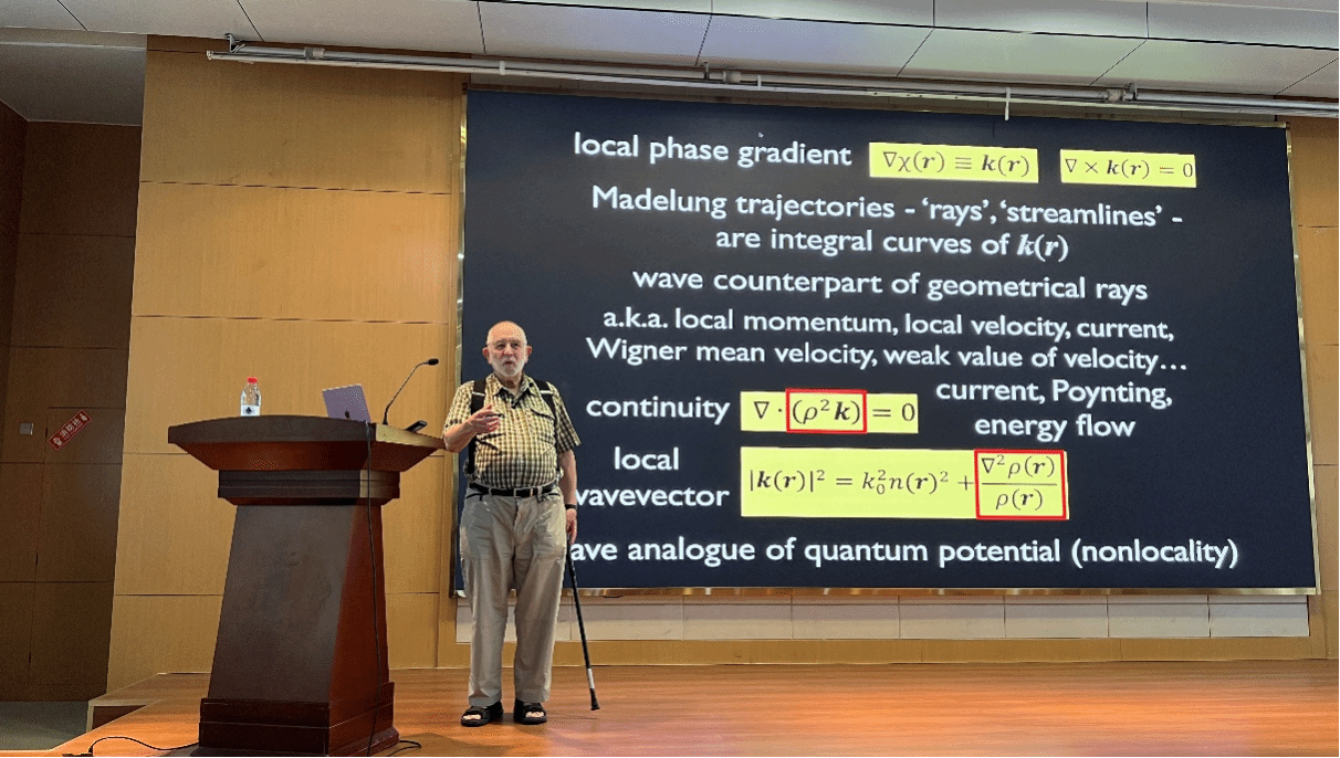 9月9日和9月11日上午,Berry教授分别以“Geometric phases old and new”和“Quantum trajectories, quantum potential, superoscillations: Madelung, de Broglie, Newton”为题作了两场学术报告,向大家介绍了几何相位两个世纪以来的发展史和量子轨迹、量子势、超振荡中的相位奇点、相位梯度、能流等数学和物理问题。9月11日晚,Berry教授与我院师生通过面对面研讨会形式进行了深入交流,解答学术困惑,提供科研生活和职业生涯规划建议等。