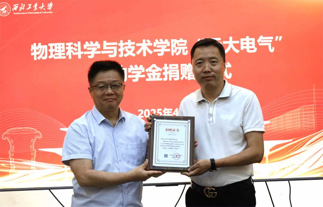 仪式上,陕西远大电气科技集团有限公司向西北工业大学捐赠设立“远大电气”奖助学金,支持物理科学与技术学院品学兼优的困难学子。