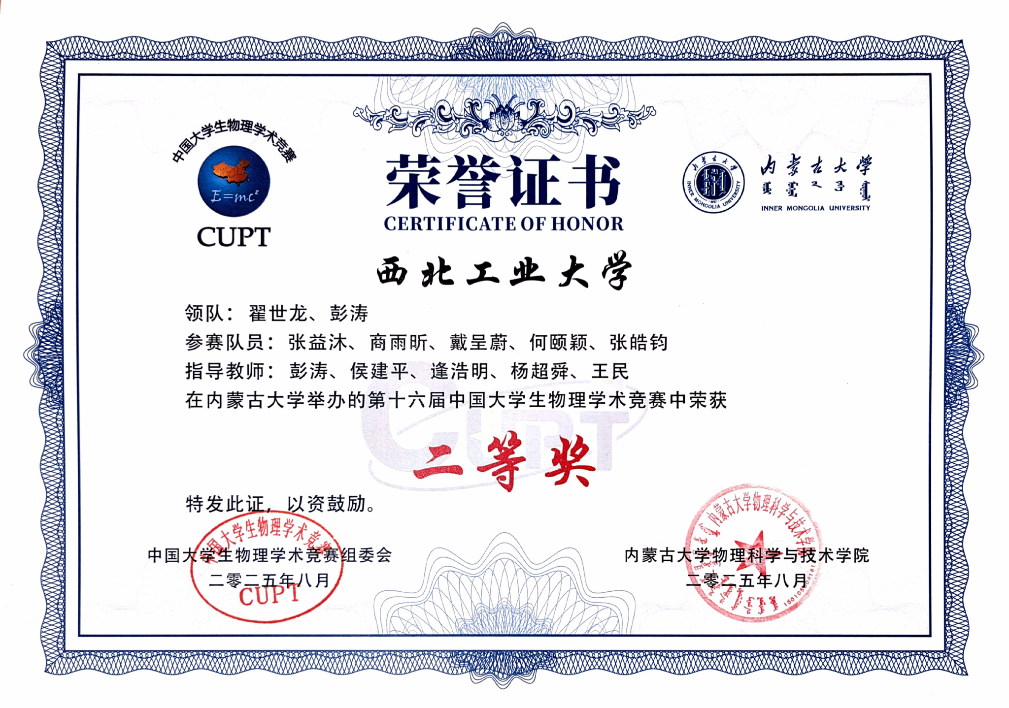 2025年8月19日,由中国大学生物理学术竞赛组委会、教育部物理学育人模式改革虚拟教研室主办,内蒙古自治区物理学会、内蒙古大学物理科学与技术学院共同承办的第十六届中国大学生物理学术竞赛(CUPT 2025)在内蒙古大学圆满结束。本届赛事继续采用“团队赛+作品赛”双赛道并行模式。其中,团队赛汇聚了从东北、华北、华东、中南、西南、西北六大区域赛以及十余个省级赛事中脱颖而出的66所高校、67支精英队伍,竞争空前激烈。我院代表队凭借扎实功底与出色发挥,最终荣获全国二等奖,并成功锁定2026年国赛直通名额。