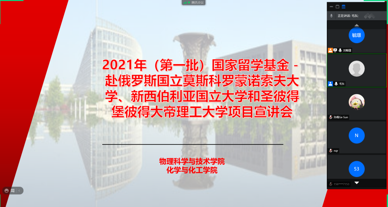 1月27日上午10:30,物理科学与技术学院、化学与化工学院组织召开了2021年(第一批)国家留学基金-赴俄罗斯3所高校项目宣讲会。本次宣讲会与会人员有:物理科学与技术学院毛东副院长、王洲航副书记、闫娜(院长助理、国际化负责人)、刘毓璟,化学与化工学院陈凯杰副院长、孙阁,国际合作处祖米热·尔肯、陈芳茗,以及两个学院本科生、硕士、博士研究生近30名。