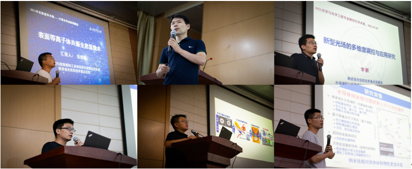 开幕式后,学科青年教师张继巍副教授、张文定副教授、张旭涛博士后、杜岳卿副教授、樊元成教授、李鹏副教授、姜亚军副研究员,分别作了题为《表面等离子体共振全息显微术》、《针尖增强纳米光子学》、《Ⅲ-Ⅴ族纳米线光电器件应用研究》、《光纤激光中振动态孤子和孤子分子动力学特性研究》、《可调超构材料主动光/电磁波调控研究》、《新型光场的多维度调控及应用》、《光纤布拉格光栅的飞秒激光制备及特性》的主题演讲。