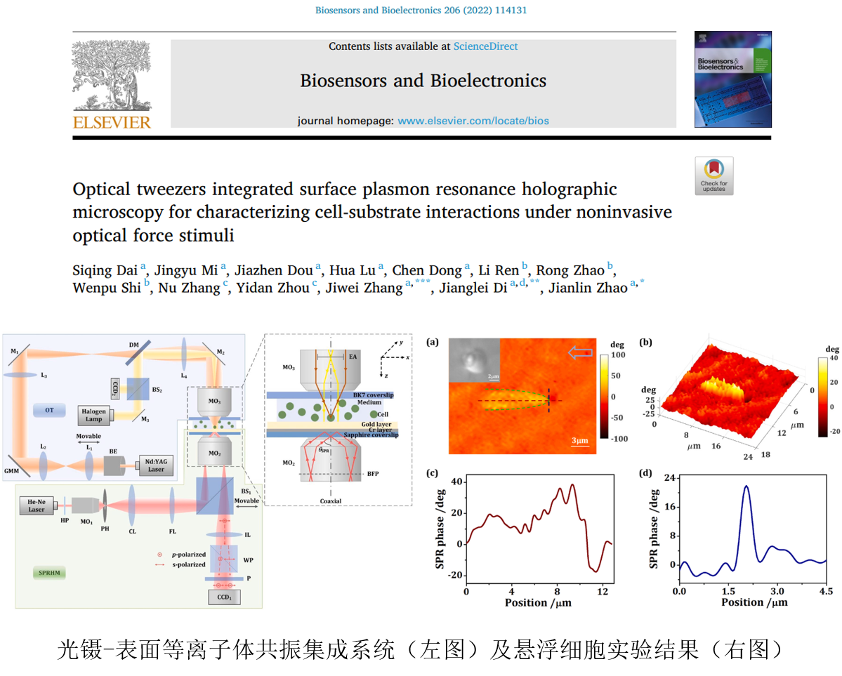 光力刺激下生物细胞与基底间的相互作用在细胞粘附、变形、凋亡等生命活动中具有重要作用。因此,有必要深入探索光力刺激下细胞-基底间的相互作用以进一步揭示外界刺激下细胞-基底界面处细胞底膜的动态变化机制。针对此问题,西北工业大学物理科学与技术学院赵建林教授课题组与西北工业大学生命学院合作,提出将光镊与表面等离子体共振全息显微镜相集成,以实现光力作用下细胞-基底间相互作用及其变化的全场动态无损测量。相关成果以“Optical tweezers integrated surface plasmon resonance holographic microscopy for characterizing cell-substrate interactions under noninvasive optical force stimuli”为题发表于国际重要学术期刊《Biosensors and Bioelectronics》(DOI: 10.1016/j.bios.2022.114131)上。这是该课题组近期发表于该期刊的第二篇相关工作。物理科学与技术学院2016级博士生戴思清为论文第一作者,张继巍副教授、邸江磊副教授和赵建林教授为共同通信作者。