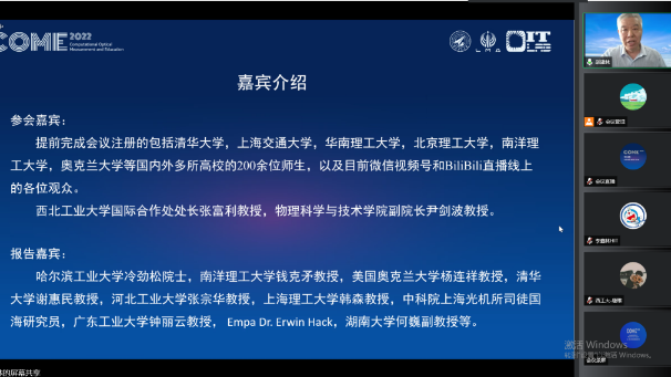 6月25日上午8:40分COME 2022正式开幕,赵建林教授主持大会开幕式,西北工业大学国际合作处处长张富利教授致欢迎辞,随后钱克矛教授介绍了COME的发展历程与举办地西安的文化背景。简短热烈的开幕式之后,大会报告正式开始。在本届会议中,哈尔滨工业大学冷劲松院士、奥克兰大学杨连祥教授、湖南大学何巍副教授、河北工业大学张宗华教授、上海理工大学韩森教授、中国科学院上海光学精密机械研究所司徒国海研究员、广东工业大学钟丽云教授、瑞士联邦材料科学与技术实验室Dr. Erwin Hack等8位国内外专家分别围绕计算光学测量做了报告。8篇大会报告异常精彩,反映出目前国际上计算光学测量学术与工程领域最前沿的学术和技术发展动态。本次COME由微信视频号和哔哩哔哩同步在线直播,会议期间两个平台线上累计观看3400余人次,同时最高在线800余人次。
