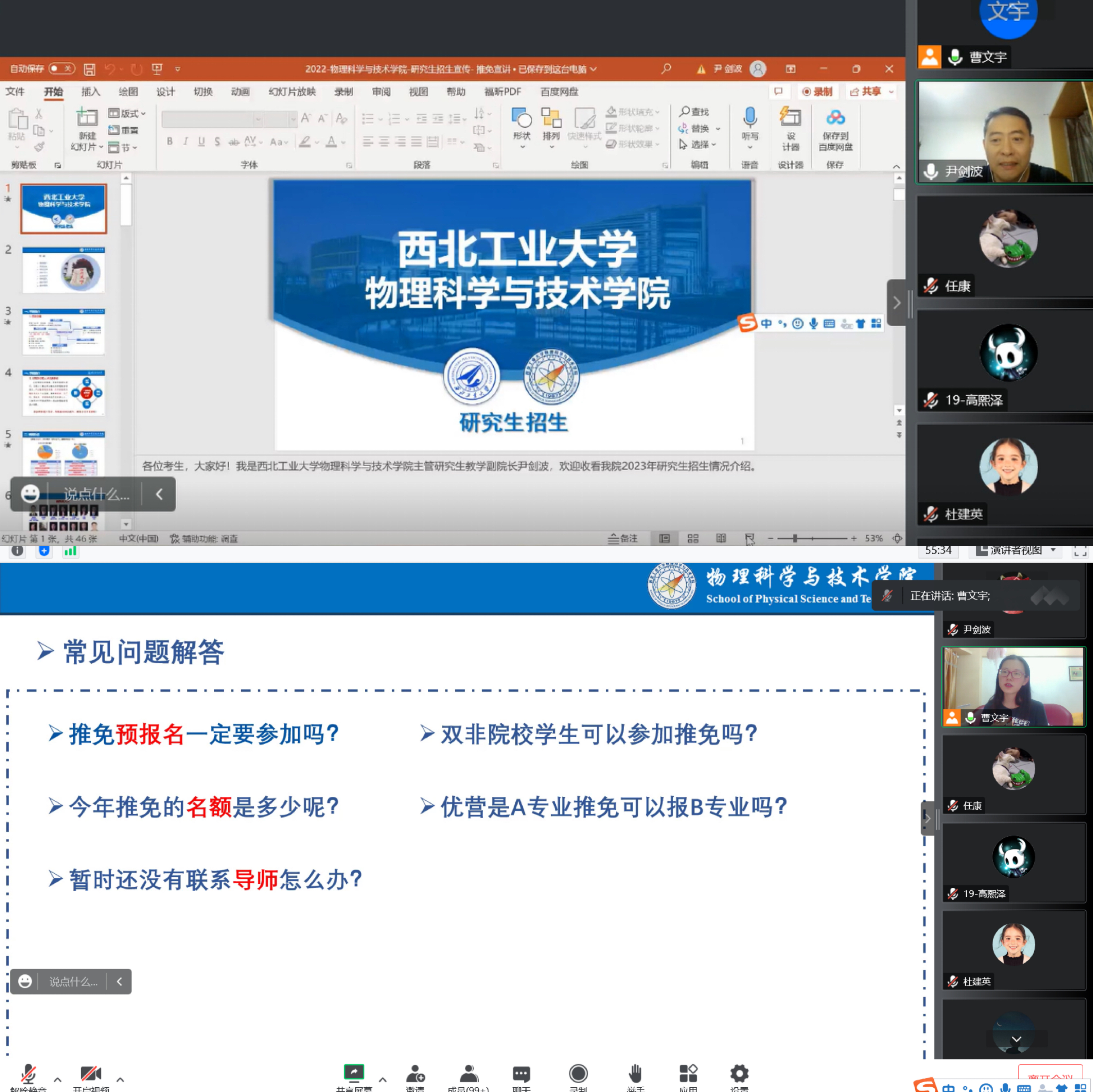 首先,副院长尹剑波从学院发展历程、师资力量、人才培养、科研平台、研究项目、成果获奖和招生专业等方面详细介绍了物理科学与技术学院的整体情况,也表示西北工业大学始终以“育国之栋梁,铸国之重器”为己任,鼓励同学们要有斗志昂扬的朝气,在大事上担当作为,在难事上勇挑重担,在急事上挺身而出,积极传承“助力三航,献身国防”的爱校爱国情怀。其后,研究生秘书曹文宇为同学们详细讲解了2023级研究生推免政策,从学校的整体规划出发,落回到学院的具体要求;强调了重要的时间节点及注意事项,力求帮助同学们顺利完成推免报名工作。