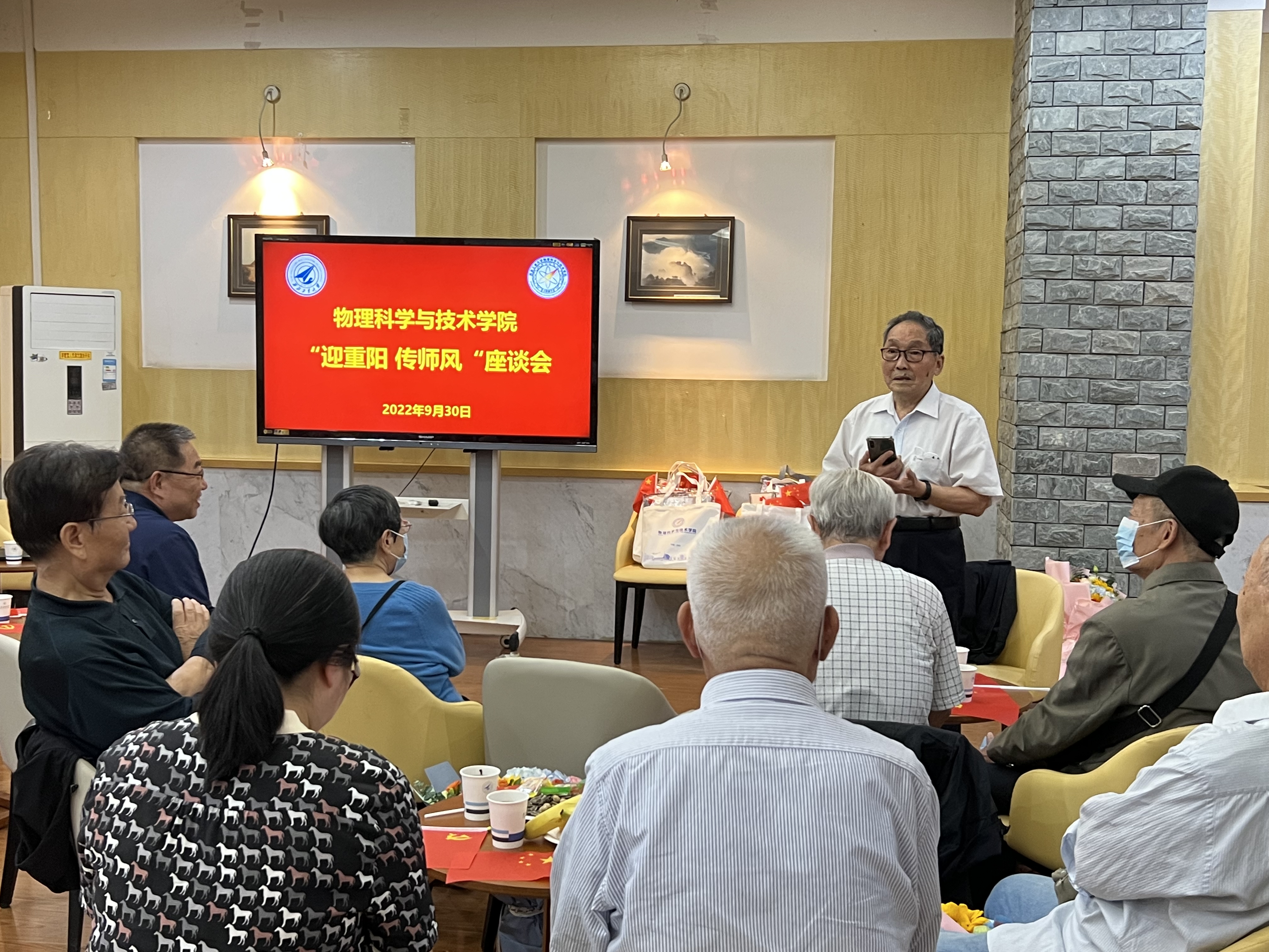 9月30日下午,物理科学与技术学院“迎重阳 传师风”座谈会在友谊校区健翔楼举行。学院党委书记晁小荣、副书记王洲航、工会主席郑建邦、院长助理闫娜、李东及其他中青年教师代表出席座谈会,与离退休老教师代表欢聚一堂、共庆佳节。