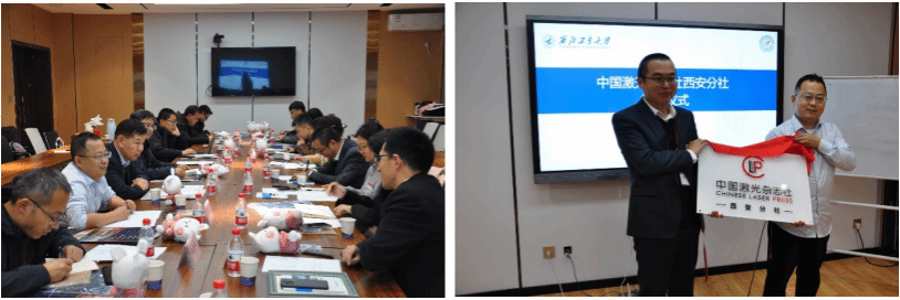 中国激光杂志社总编辑王晓峰和毛东教授一起为西安分社揭牌。随后,总编辑王晓峰为西安分社社长毛东教授、副社长雷铭教授、副社长张正龙教授、副社长兼秘书长姜碧强教授颁发了聘书。