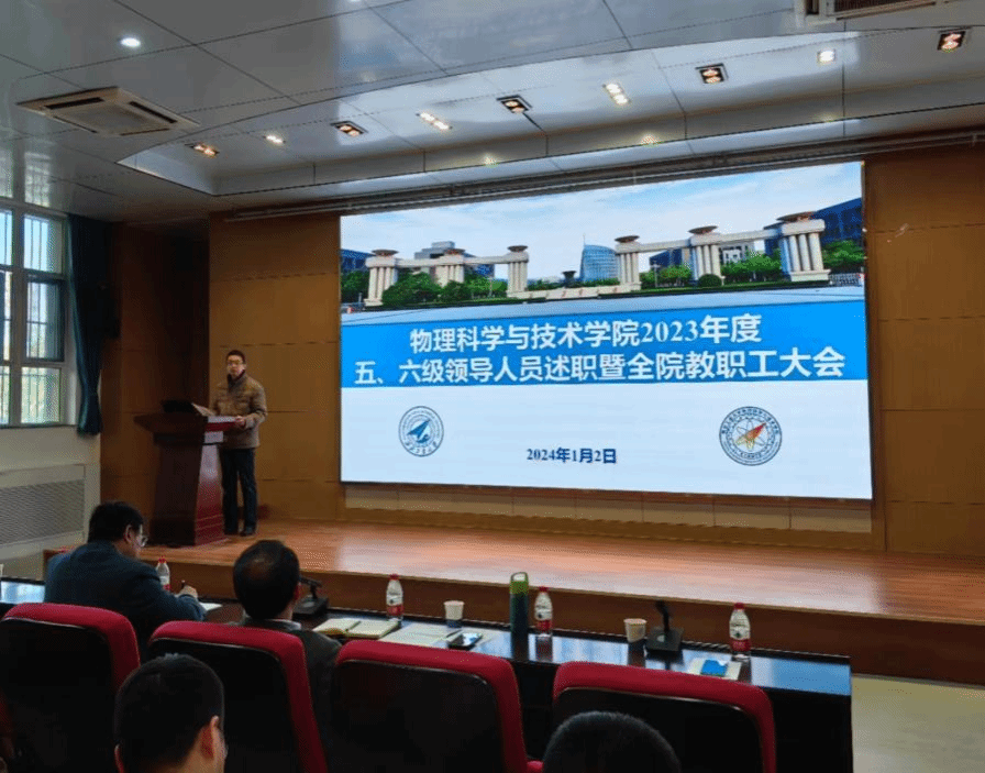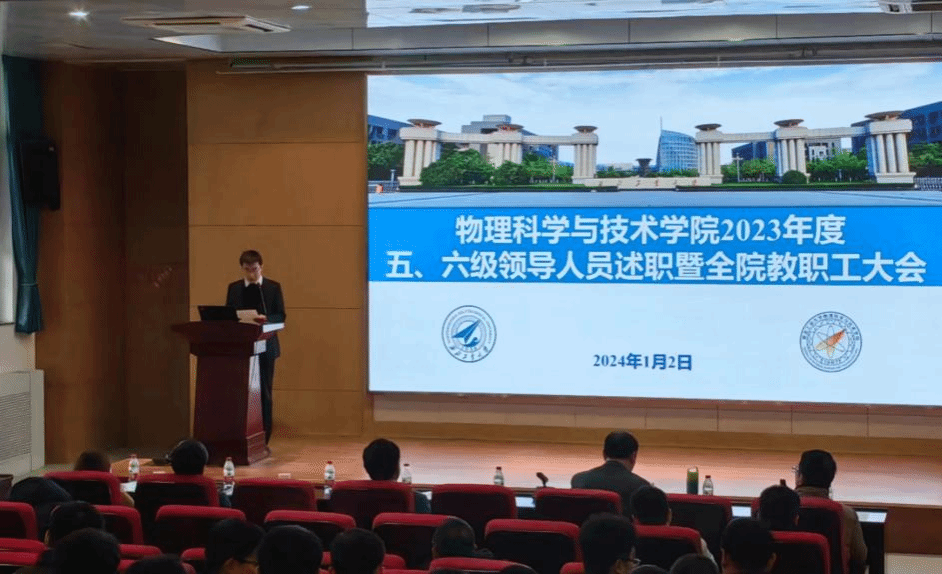 2024年1月2日下午,物理科学与技术学院在学院楼报告厅召开2023年度五、六级领导人员述职暨全院教职工大会。魏炳波院士、学院党政领导班子及学院全体教职工参加了会议。会议由学院党委书记晁小荣主持。