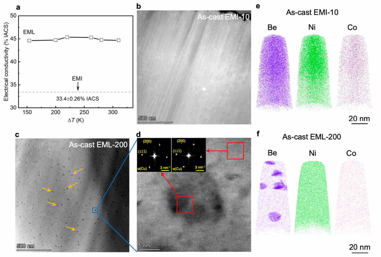 图1 Cu-0.2Be-1.0Ni-0.2Co (wt.%)合金在电磁感应(EMI)和电磁悬浮(EML)条件下的电导率和显微组织特征。(a) EML样品电导率随过冷度的变化,灰色虚线表示EMI样品的电导率。(b) EMI-10样品的HAADF-STEM图像。(c) EML-200样品的HAADF-STEM图像,球形斑点(橙色箭头)为富铍团簇组织。(d) 图c中蓝框区域的放大原子图像,内嵌图为团簇内外FFT图。(e, f) EMI-10和EML-200样品APT原子分布图。
