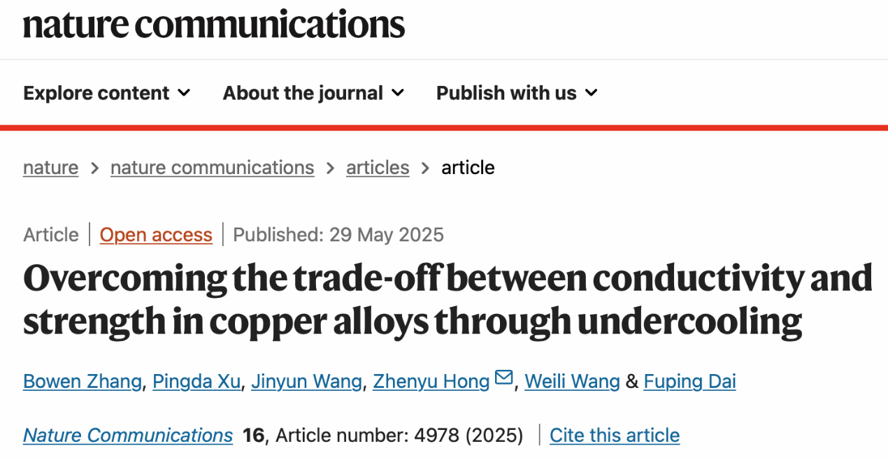 近日,西北工业大学物理科学与技术学院洪振宇教授课题组利用无容器处理技术在铜合金组织与性能调控领域取得重要研究进展。研究发现,铍铜合金熔体在深过冷凝固过程中可产生球形富铍团簇组织,该组织能大幅度提升合金的综合性能。相关研究成果以“Overcoming the trade-off between conductivity and strength in copper alloys through undercooling”为题发表于国际高水平期刊《Nature Communications》,并被编辑遴选为特色文章(Featured articles)。